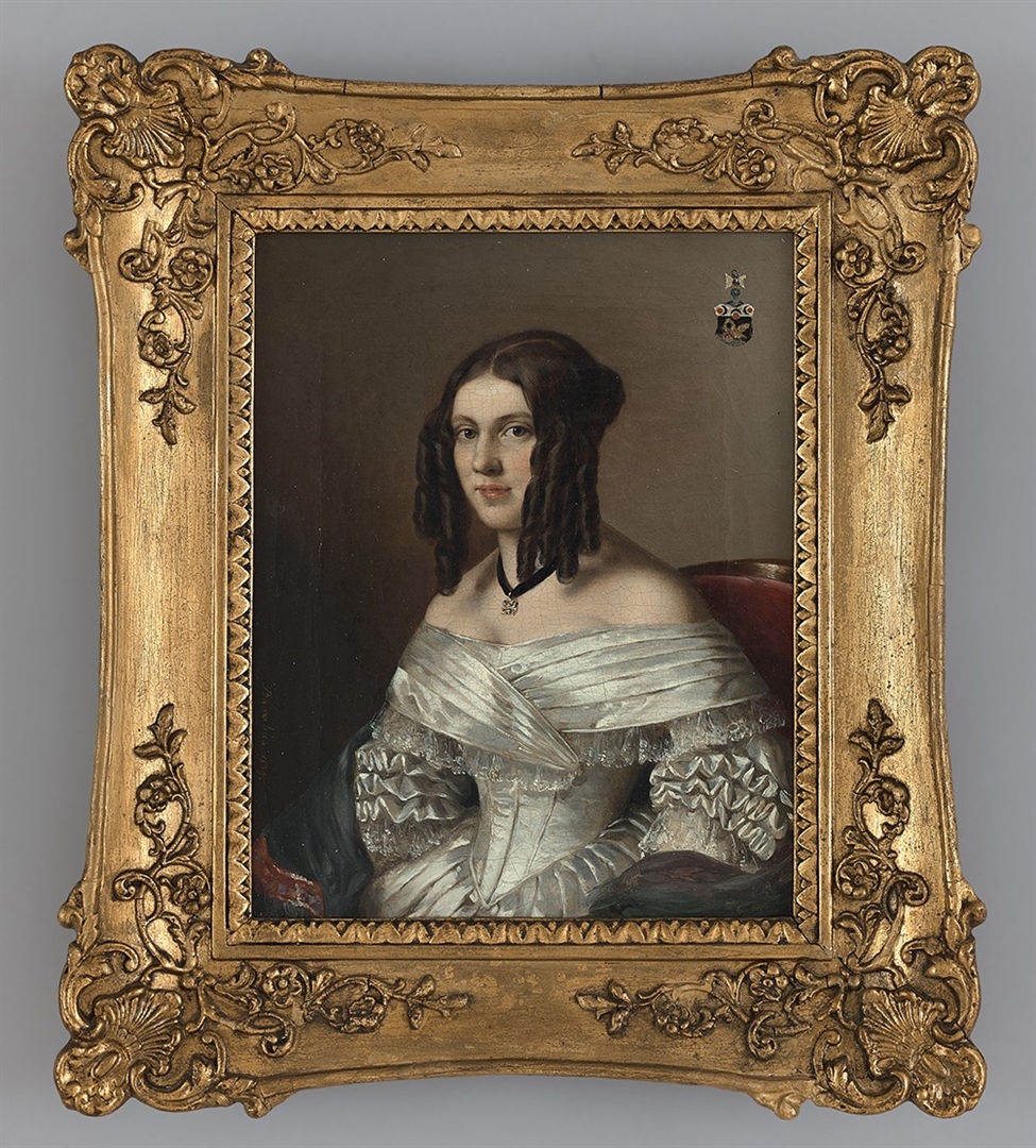 Portre Hitterot Žena 25-ih godina u bijeloj haljini. Kosa smeđa. S obe strane dva snopa uvojaka. Oko vrata crna traka sa zlatnim privjeskom. Haljina dekoltirana sa velikom okovratnikom. Rukavi i suknja naborani. Zeleni šal pokriva ruke. Iza dame visi naslon crvene fotelje. Pozadina smeđa. Na desnom uglu grb. Zlatni okvir sa motivom cvijeća na uglovima. (Inventarna knjiga 1-3, 1. tom)