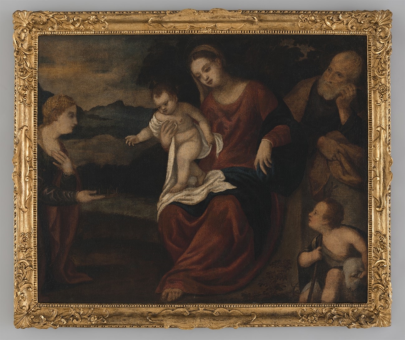 Grupa Bogorodice s Djetetom i sv. Ivan Krstitelj preuzeti su sa slike Polidora de Lanciana "Bogorodica s Djetetom i malenim sv. Ivanom Krstiteljem" koja je prema Vincenzu Manciniju nastala oko 1535. godine. Ona se do 1638. godine nalazila u Veneciji, u zbirci Bartolomea della Nave. Kasnije prelazi u Zbirku Hamilton, točnije u rzke Jamesa (1606. - 1649.), trećeg markiza i prvog vojvode Hamiltona. Već 1659. godine, skupa s čitavom zbirkom u kojoj se nalazila, postaje vlasništvo nadvojvode Leopolda Wilheima Austrijskog. Čuvala se najprije u Bruxellesu, a zatim u Beču, gdje joj se krajem 18. stoljeća gubi svaki trag. Kompozicija ove izgubljene slike poznata je zahvaljujući grafičkom listu Pietera van Lisebettena (Petrus Lisbetius, Antwerpen 1630. - 1678.) objavljenom 1660. godine u "Theatrum Pictorium" Davida Teniersa, odnosno u ilustriranom inventaru nadvojvodine zbirke (Mancini 2001:132-133, 180, kat. 26).