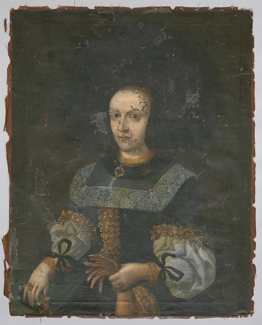 Portre Hütterott. Starija žena sa visokim čelom i tankim velom na glavi. Crna haljina i čipkasti ovratnik preko grudi. Bogati rukavi sa rubom zlatnih traka. Iz haljine izlaze bijeli rukavi, koji završavaju crnom mašnom. Dvije lančane narukvice i ogrlica sa privjeskom. U desnoj ruci drži knjigu položenu na stol a u lijevoj žute rukavice. Na desnoj ruci ima četiri prstena, na lijevoj tri. Rama sa zlatnim rubom. (Inventarna knjiga 1-3, 1. tom)