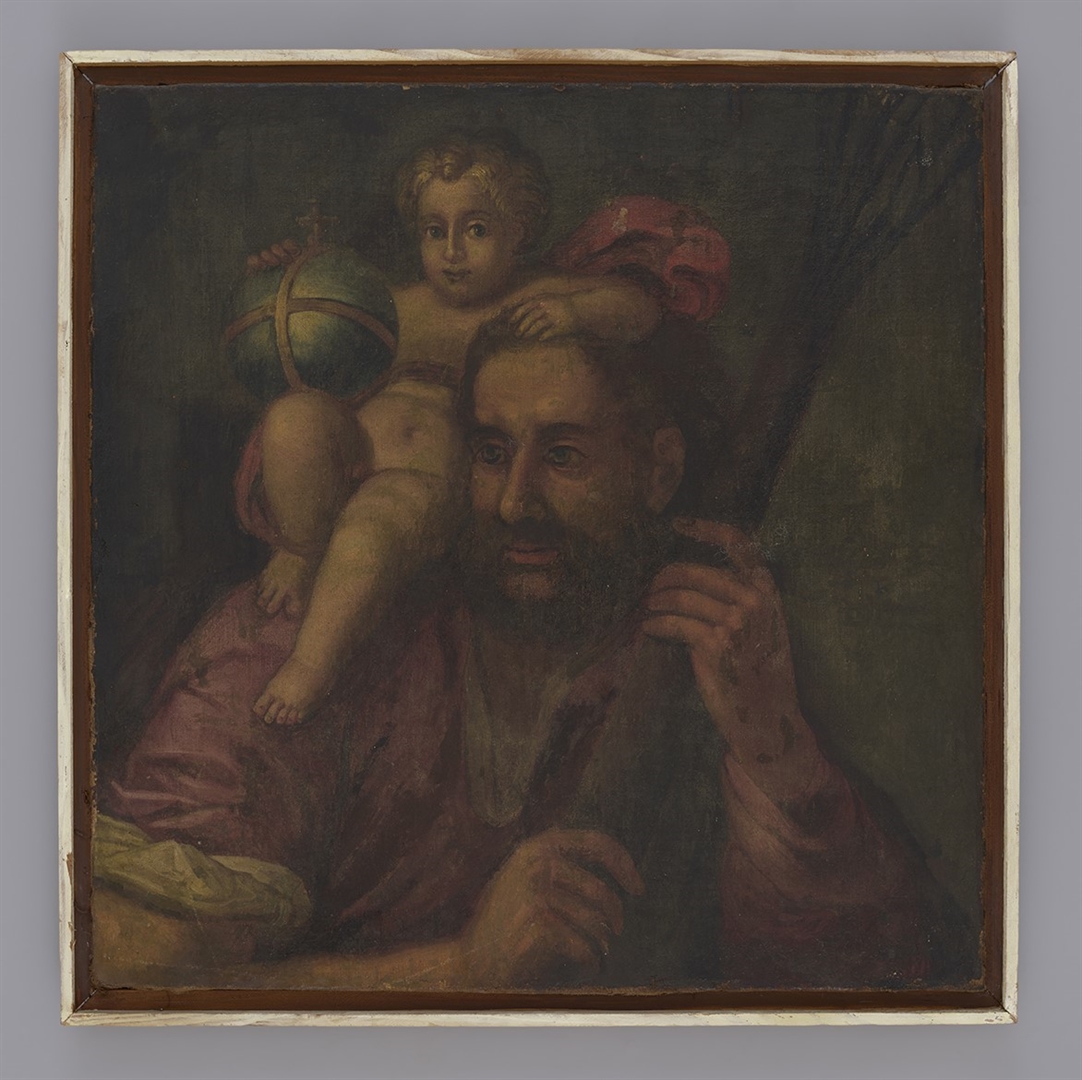 S. Kristofor. Čovjek s bradom i brkovima drži na desnom ramenu dijete. Obučen je u haljinu višnjeve boje iz koje viri bijela košulja oko vrata i na desnoj ruci. Rukama drži granu drveta. Dijete koje mu sjedi na ramenu drži lijevom rukom zeleni globus s krstom na vrhu. Lijevu ruku je oslonila na glavu čovjeka. Ima plavu kosu i lepršavi crveni plašt iza njega. Pozadina tamno zelena. Rama bijela sa unutarnjim smeđim rubom. (Inventarna knjiga 1-3, 1. tom)