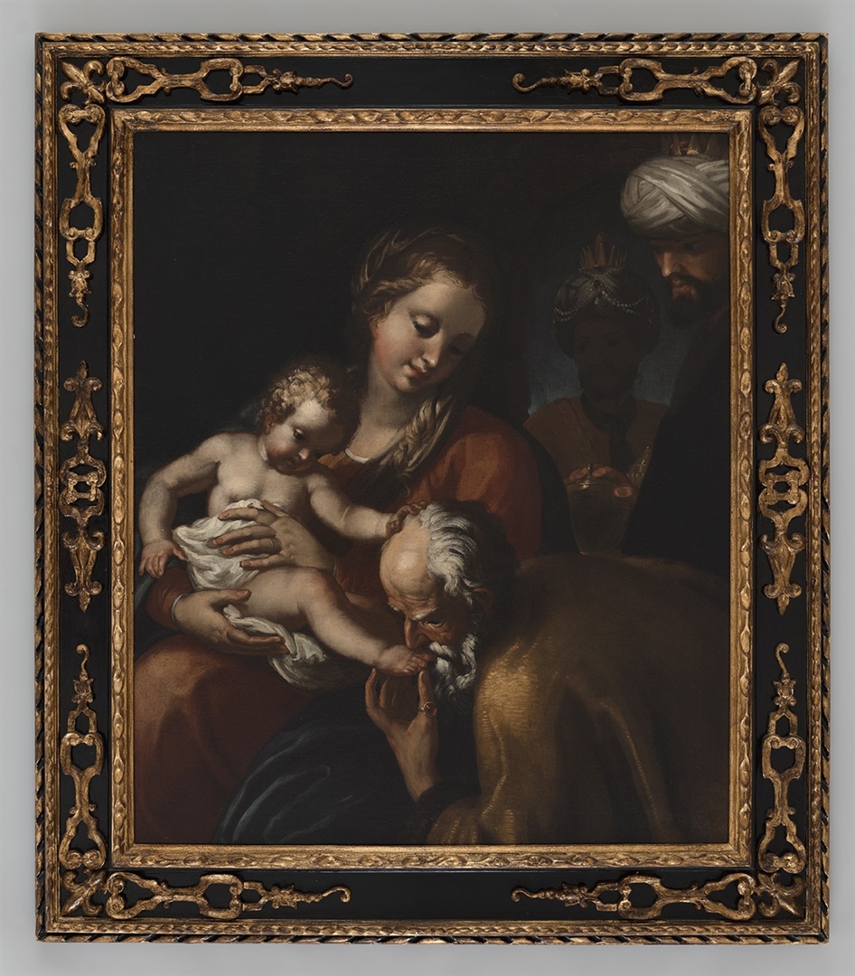 Bogorodica, prikazana do pojasa, sjedi s Djetetom u krilu. Maleni Krist okrenut je na desnu stranu, a svoju je lijevu ručicu položio na glavu kralja Melkiora. Najstariji od triju kraljeva odjeven je u smeđežuti plašt, sagnuo se i ljubi mu stopalo. Desno u pozadini se vide druga dva kralja, Gašpar i tamnoputi Baltazar s turbanima povrh kojih se nalaze krune, a u rukama drže ciborije s darovima.