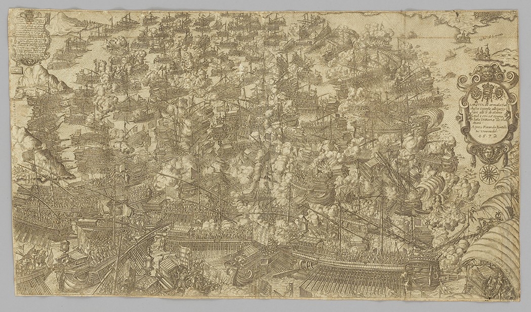 Prizor pomorske Bitke kod Lepanta (Kurzolara), koja se vodila 7. listopada 1571. između flota Svete Lige (Španjolska, Venecija, Genova, Papinska Država, Vojvodstva Toskana, Savoja, Urbino i vitezovi Hospitalljeri Malte), kojom je zapovijedao Don Juan od Austrije (24. veljače 1547. – 1. listopada 1578.), i Osmanlija, kojima je zapovijedao Veliki admiral Müezzinzade Ali Paša (poginuo 7. listopada 1571.), koja je rezultirala pobjedom Svete Lige. Četvrti osmansko-venecijanski rat (1570. - 1573.). Orientiran sjeverozapadom prema vrhu (M[aestro]; kompasna ruža: Tramontana – sjever; Greco – sjeveroistok; križ: Levante – istok; Scirocco – jugoistok; Ostro – jug; Africanus – jugozapad; Ponente – zapad). U ukrašenoj kartuši nadvijenom lavljom glavom (simbolom Venecije), sadržano je grbovlje: lijevo - cara Filipa II., sredina - Papinske Države, desno - ? (E. R., 22. X. 2024.)