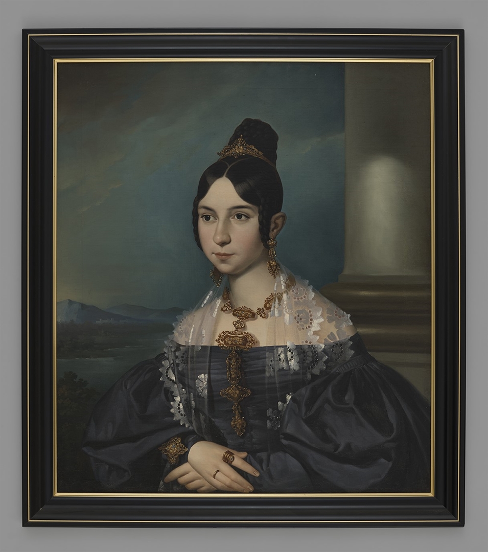 Mlada djevojka sa crnom kosom razdijeljenom u sredini, ispletenom u dvije pletenice koje se spuštaju do ispod ušiju. Na vrhu glave pletenice savijene u mali turban oko kojega je zlatni ukras. Na ušima su duge tročlane naušnice. Ramena su obnažena a oko vrata se spušta zlatni lanac sa medaljonima sa cvečem. Preko ramena spušten je bijeli prozirni šal. Crna haljina sa bogatim rukavima koji se sužavaju. Ruke su prekrižene i na desnoj ima narukvicu, na kažiprstu prsten u obliku savijene zmije i na prstenjaku burma. U pozadini na desno kolona sa pozlačenom bazom. Na lijevo pejsaž planina i mora. Nebo zeleno sa sivim oblacima. (Inventarna knjiga 1-3, 1. tom)