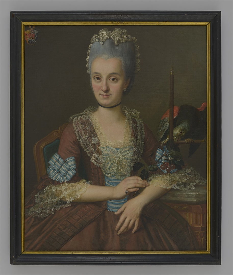 Mlada žena prikazana je frontalno kako sjedi u naslonjaču kraj pisaćeg stola na koji je položen stalak s raznobojnom papigom. Ptica se proteže prema grančici s trešnjama koju joj žena pruža. Odjevena je u svilenu haljinu po modi 18. stoljeća ciglastocrvene boje koja na rukavima ima aplicirane svilene vrpce s bijelim i svijetloplavim prugama. Duboki izrez na haljini ukrašen je čipkom jednakoj onoj na manšetama rukava. Na glavi ima napudranu i alla fontage bogato ukrašenu vlasulju: Na jednoličnoj smeđesivoj pozadini ističe se oval licasvijetlog inkarnata s izražajnim, tamnim očima. U lijevom gornjem kutu nalazi se grb obitelji Hütterott ispod kojeg je upisana godina 1776. Prema muzejskim inventarima slika je pripadala zbirci baruna Hütterotta, na što upućuje i obiteljski grb u gornjem lijevom kutu formata. Upisana godina i podaci iz rodoslovlja ove bogate kasselske obitelji (Hütterott 1981:22, tab. 2) upućuju na to da je portretirana žena Barbara Elisabeth, a ne njezina majka Martha Elisabeth Hütterott, kako je navedeno u inventarima. Barbara Elisabeth Hütterott rođena je 19. prosinca 1746. u Spangenbergu. Njezini su roditelji bili Martha Elisabeth Bäcker, rođena 1722. u Spangenbergu i umrla 1782., i Jacob Philipp Hütterott, trgovac vunom rođen 1710. u Spangenbergu, a umro 1765., koji su se vjenčali 4. svibnja 1742. Iz rodoslovja je vidljivo da je u vrijeme nastanka portreta Barbara Elisabeth imala tridesetak godina, što odgovara dobi portretirane žene. Iako njezin stav, posebice elegantne kretnje ruku, još uvijek prizivaju likovni rječnik kasnog rokokoa, sklonost detaljnom opisu fizionomije i raskošne odjeće te obilje scenografije omogućuju da se djelo približi krugu njemačke građanske portretistike posljednje četvrtine 18. stoljeća. Vješta modelacija naročito dolazi do izražaja u blagim tonskim prijelazima koji dočaravaju baršunastu mekoću napudrane kože i teksturu različitih materijala odjeće. (Lavinia Belušić u: Slikarska baština Istre, str.487-488)