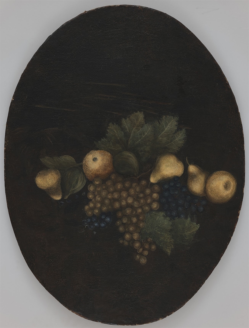 Mrtva priroda koja prikazuje košaru u kojoj ima raznih vrsta voća: jabuke, kruške, grožđe žuto i crno, smokve i lišće svega toga voća. Pozadina tamna, slika ovalna. (Inventarna knjiga 1-3, 1. tom)