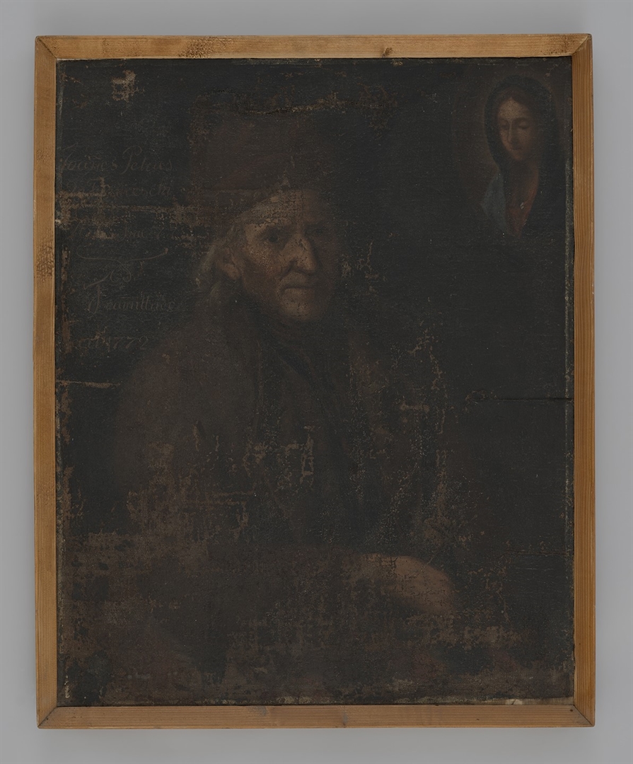 Stariji čovjek sa dugom sijedom kosom. Na glavi tamno crvena kapa. Obučen u smeđe, sjedi desnom rukom položenu na lijevu. Pozadina tamna, a u gornjem desnom uglu glava Madone sa smeđom kosom, ružičasta haljina i plavi plašt. Na lijevo natpis: Joanes Petris De Franceschi. Anni Suae 77. Framillner fecit 1772. Farba je na više mjesta otpala. Gore poderotina od 19 cm. (Inventarna knjiga 1-3, 1. tom)