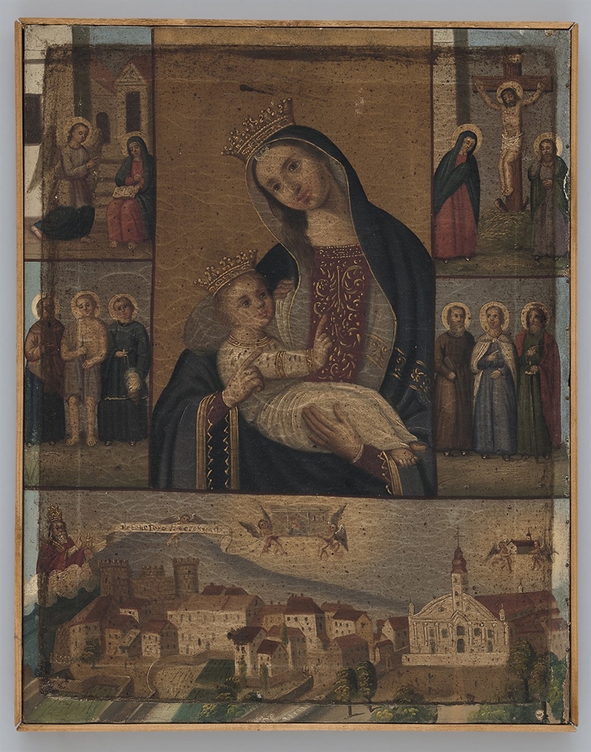 Slika se sastoji od glavne slike oko koje ima još pet manjih. Glavna slika prikazuje Madonu s dijetetom. Obučena u crvenu haljinu sa zlatnim motivima cvijeća i lišća. Tamno plavi plašt sa zlatnim rubom i vezom. Glava sa dugom smeđom kosom je spuštena i na glavi zlatnu bogatu krunu. Rukama pridržava dijete obučeno u dugu bijelu tuniku sa zlatnim rubom oko vrata i na rukavima. Dijete, kao i majka, diže kažiprst desne ruke. I dijete ima na glavi bogatu krunu. Pozadina žuta. Na slici, u gornjem lijevom uglu, Madona sjedi sa otvorenom knjigom na koljenima. Ima crvenu haljinu i plavi plašt. Noge bose. Kraj nje anđeo sa bijelom tunikom plavoga ruba, kleči i pruža desnu ruku prema madoni, dok lijevom pridržava cvijeće. Oko glave aureola. Iza toga su kuće i stepenice. Na drugoj slici tri sveca sa aureolom. Prvi sa smeđom kosom i bradom, obučen u smeđu haljinu i plavu pothaljinu. Desna ruka ispružena prema svecu, koji se nalazi u sredini. Obučen plaštom koji mu ostavlja golo lijevo rame i noge. Treći svetac obučen u crnu haljinu drži u ruci kadionicu. Na slici u gornjem desnom uglu, Isus na križu. Ispod križa Madona sa spuštenom glavom, obučena u crvenu haljinu i plavi plašt. Na desno svetac sa smeđom kosom, bradom i brkovima obučen u smeđu haljinu sa zelenim plaštom. Na drugoj slici, na desno, opet tri sveca. Prvi sa dugom bradom obučen u smeđu haljinu, drži knjigu pod desnom rukom, drugi u bijeloj haljini i plavi plašt, spojeni na grudima medaljonom. Treći opet s bradom u zelenoj haljini i crvenom plaštu drži u lijevoj ruci mač. Svi troje imaju aureolu oko glave. U donjoj slici prikazan je grad sa kulama na lijevo i crkvama desno. Na lijevo u nebu na jednom oblaku, kralj sa krunom i crvenim plaštom, gleda u grad. Ucentru tri anđelčića nose traku sa natpisom i jednu arku. U pozadini planine i svijetlo nebo. (Inventarna knjiga 1-3, 1. tom)