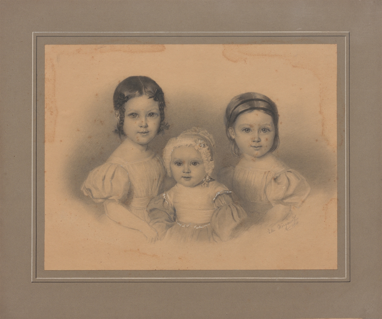 Sestre Hütterott. Crtež napravljen olovkom, prikazujetri djevojčice. Prva ima crnu kosu, pletenice i četiri mašnice na glavi. Haljina sa kratkim nabranim rukavima. Druga, jako mala, ima na glavi bijelu kapicu sa čipkama. Treća sa svijetlom kosom ima dvije trake preko glave. U donjem desnom uglu ime crtača: Etti Verganez 1911. (Inventarna knjiga 1-3, 1. tom)