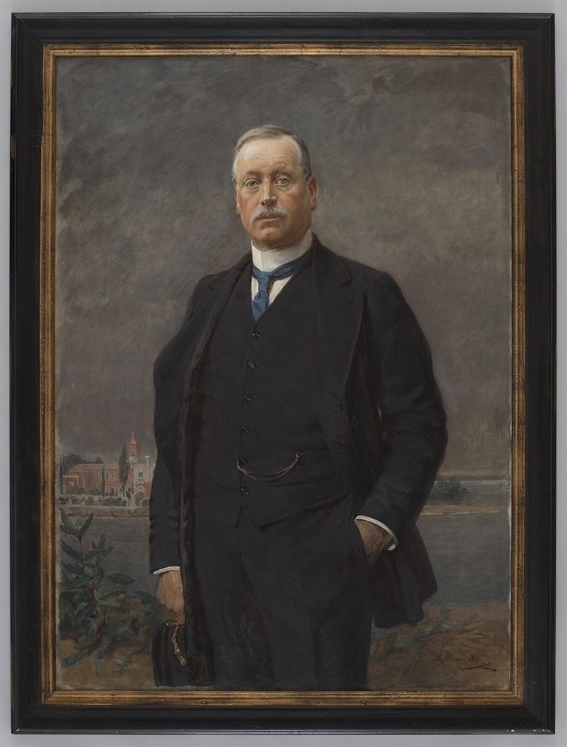 Čovjek sa sijedom kosom i brkovima. Oči plave. Visoko čelo. Košulja bijela sa visokim naštirkanim okovratnikom. Kravata svijetlo plava. Odijelo tamno plavo. Zlatni lanac džepnog sata visi iz džepa prsluka. U desnoj ruci drži kapu. Lijevu ruku drži u džepu. U pozadini dvor na crvenom otoku. Nebo sivo. (Inventarna knjiga 1-3, 1. tom)