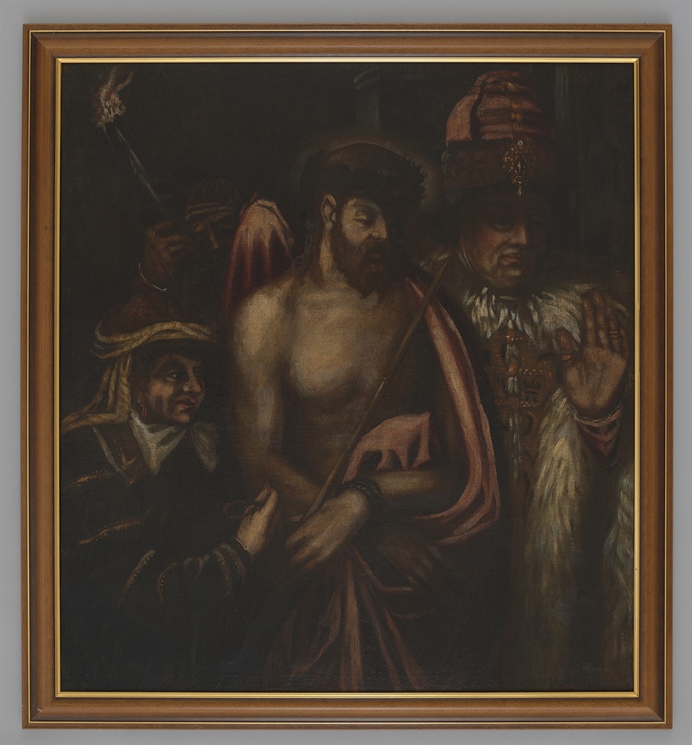 Ecce homo iz rovinjskog Muzeja, čije porijeklo nije zabilježeno u inventarnim knjigama, relativno je kasna i likovno slaba kopija. Od izvorne Tizianove kompozicije odstupa u nekoliko detalja koji odgovaraju zahtjevima pučke pobožnosti i naracije. Figura nasmiješenog mladog paža lijevo od Krista na Tizianovoj slici pretvorena je stoga u krvnika s turbanom, dok je u tek naznačenoj pozadini uz baklju dodan i treći pratilac. Autor kopije na nespretan i nevješt način slijedi predložak, pojednostavljujući pritom tonske i kolorističke odnose. Htijenje da se podražava sloboda i sintetičnost Tizianova poteza u izgradnji forme rezultirala je pak grubim, gotovo karikaturalnim oblikovanjem fizionomija te odjeće i ukrasa, kao i neuvjerljivom impostacijom likova u prostoru. Slika je bila u lošem stanju sačuvanosti, s mnoštvom mehaničkih oštećenja. (Višnja Bralić u: Slikarska baština Istre, 2006., str. 446-447)