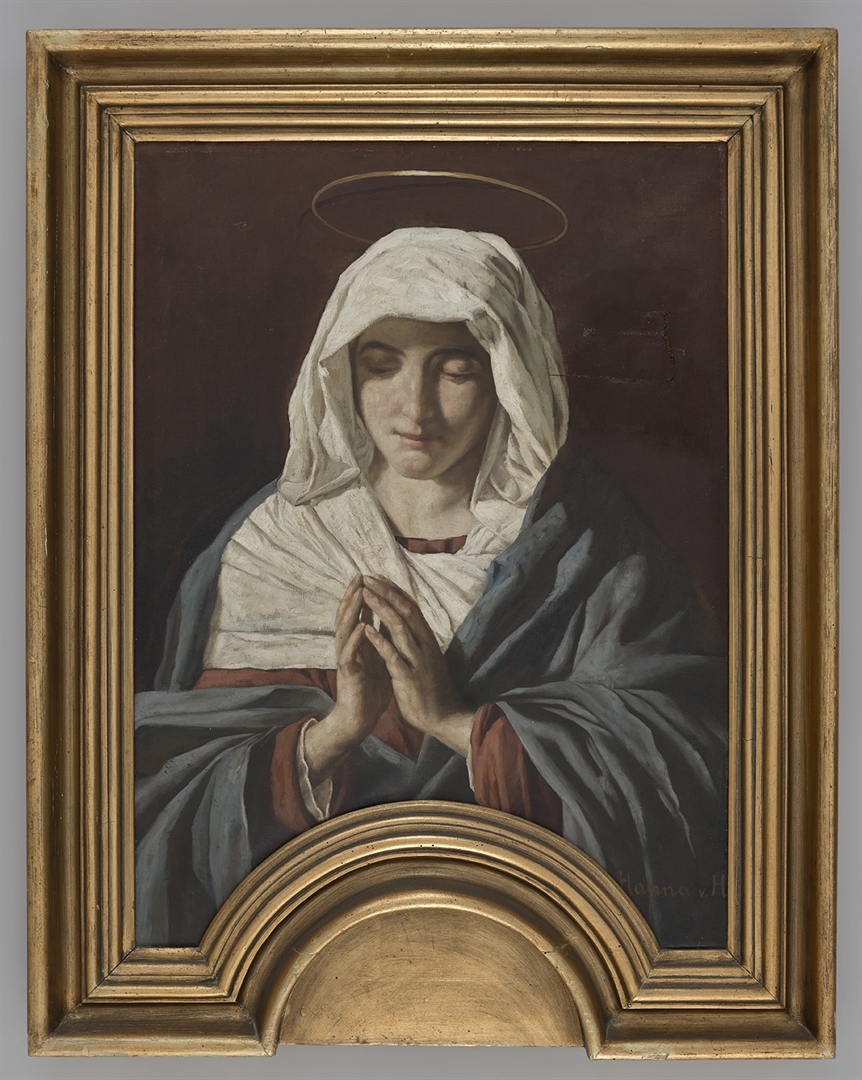 Poprsije Madone koja moli. Glava i ramena pokrivena bijelim velom. Preko toga plavi plašt. Haljina višnjeve boje. Iz rukava visi malo bijele košulje. Ruke sklopljene, glavo malo spuštena. Pogled prema dole pozadina tamna. Iznad glave zlatni krug. Dole piše: Hanna V. H. (Inventarna knjiga 1-3, 1. tom)