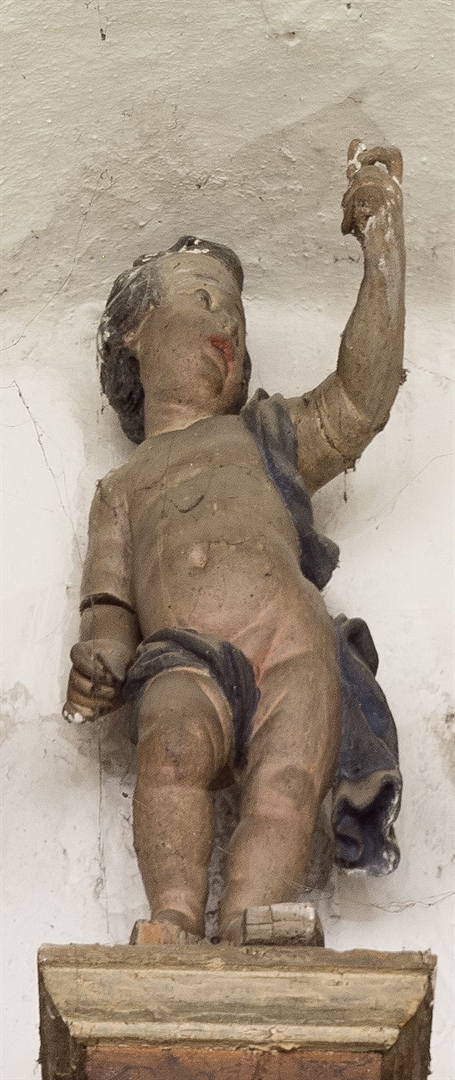 Drveni kip anđela dijeteta sa crnom kratkom kosom. Inkarnat smeđe ružičaste boje sa crvenim usnama. Glavu je okrenuo prema lijevoj podignutoj ruci. Desnu ruku je spustio uz tijelo. Težinu tijela je oslonio na lijevu nogu. Crna marama mu pokriva lijevo rame, desni kuk i leprša iza lijevog kuka. Kip se nalazi na vrhu oltara. (Inventarna knjiga 1-3, 1. tom)