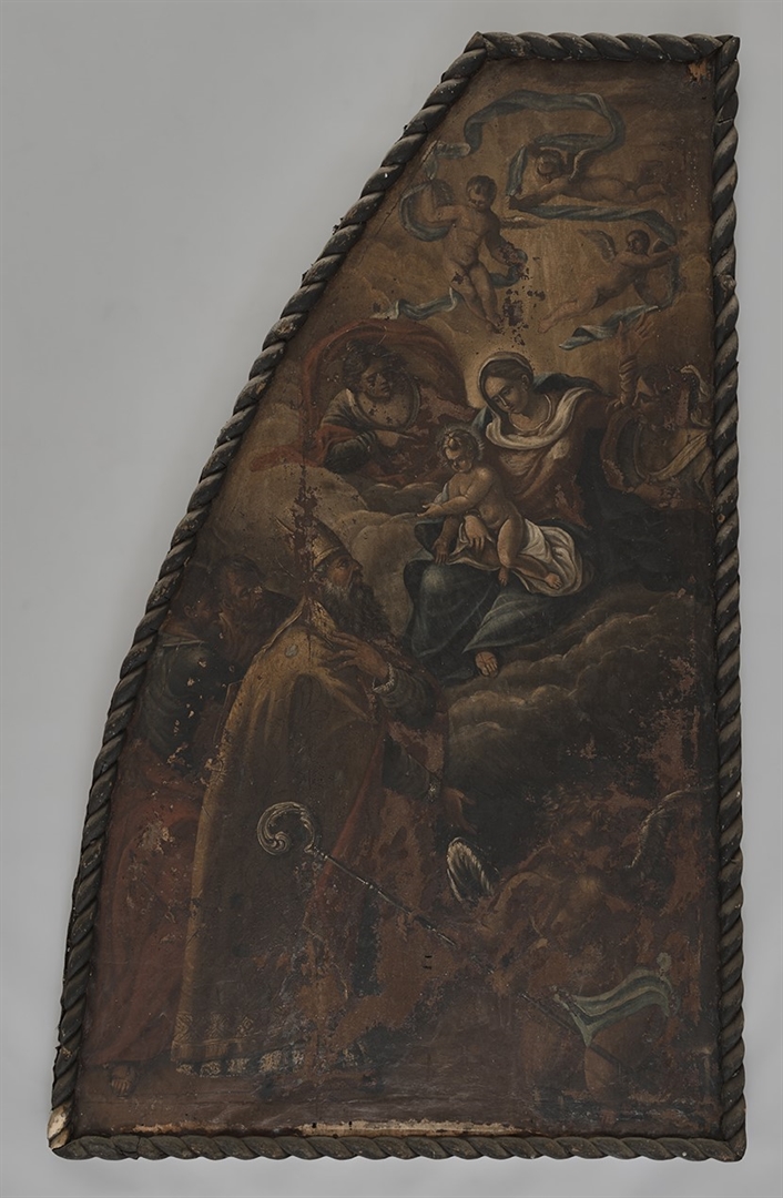 Svetac sa sijedom kosom i bradom okrenut iz profila. Na glavi ima zlatnu tiaru. Obučen je u žuti plašt do poda iz koga viri bogato naborana haljina. Iz plašta izlaze ruke obučene u tamne rukave s bijelom čipkom. Lijevu je ruku položio na desno rame a desnu ruku je ispružio prema centru slike. Iza njega pri lijevom rubu slike nejasna figura čovjeka obučena u tamno sa crvenim plaštom i sandale na nozi. U donjem desnom uglu anđeo plave kose drži obim rukama pastirski štap sa srebrnim uvojkom. Anđeo je spustio glavu na lijevom ramenu. Noge je savio u koljenima. O pasu ima zelenu maramu. U drugom planu gore na jednom bijelo-sivom oblaku sjedi Madona s djetetom. Ogrnuta je plavim plaštom. Haljina joj je višnjeve boje. Na glavi ima bijeli veo koji se spušta na ramena i oko vrata. Lijevu ruku je podigla gore dok desnom pridržava plavo obnaženo dijete. Dijete sjedi majci u krilu na bijeloj marami. Ispružilo je desnu ruku dole a lijevom pokazuje prema svecu u sredini. Na obe strane Madone poprsje jedne žene. Žena na lijevom ogrnuta je crvenim lepršavim plaštom. Pogled prema djetetu i desnim kažiprstom pokazuje prema njemu. Desna žena, glavom iz profila ima d traga kosu vezanu bijelom maramom, haljina zelenkasta sa bijelim okovratnikom. Kosa tamna. Na gornjem dijelu slike tri obnažena anđela, nose lepršavu traku. Na više mjesta farba je otpala. Slika je oštećena na donjem rubu. (Inventarna knjiga 1-3, 1. tom)