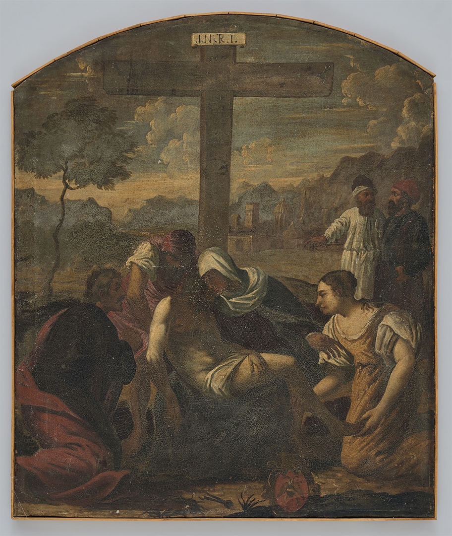 U punoj svjetlosti žena riđe kose obnažena vrata i ruku. Iz žute haljine izlaze bijeli rukavi s bogatim naborima. U lijevom uglu napred kleči čovjek duge kose i brkova nagnut je prema Isusu, ima crnu haljinu sa bogatim crvenim plaštom. Iznad isusa pod križom nagnut je čovjek u pokretu depozicije. On ima crvenu kosu i plašt sa bijelim rukavom, jako naglašenom. U drugom planu križ sa natpisom INRI ispod koga se razvija pejsaž. Sasvim na desno dva čovjeka sa turbanom u živom razgovoru. Jedan je u bijeloj opravi a drugi u tamnoj. Iza njih usamljeno stablo iza koga je šuma. U pozadini grad sa zvonicimai hramovima. Iznad njega plavičaste planine. Na plavičastom nebu, osvijetljeni oblaci. Dole u desnom uglu grb sa orlom sa dvije glave. (Inventarna knjiga 1-3, 1. tom)