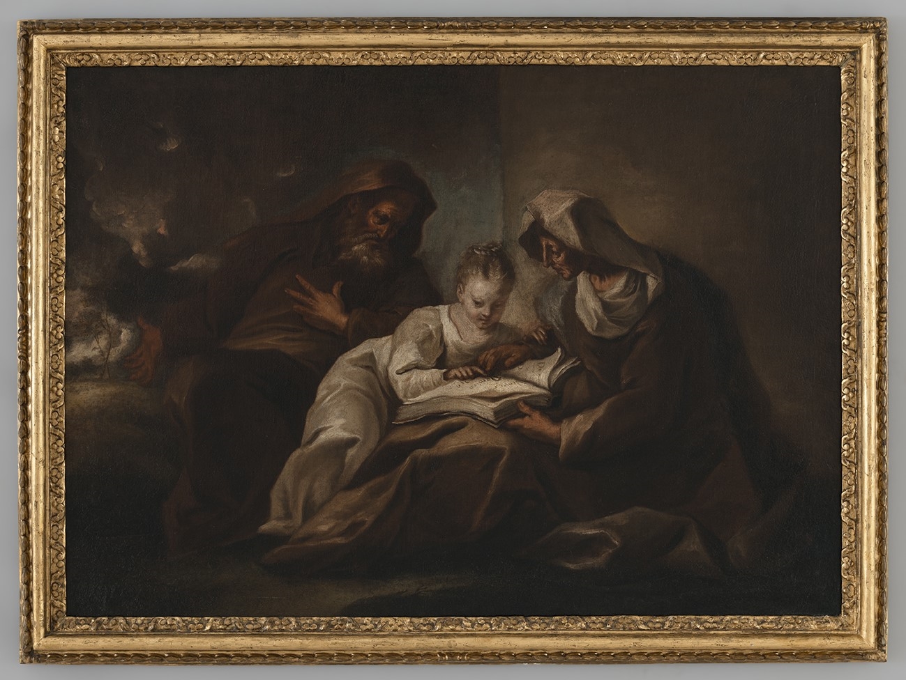 Svijetlo se odbija od knjige, koja leži na koljenima i lijevom rukom je pridržava, starija žena, koja je nagnuta prema djevojčici i desnom rukom vodi njenu ruku. Žena je starija sa tamno smeđim plaštom koji joj prikrivava glavu i spušta se u širokim naborima koji prekrivaju ispruženu nogu. Treća figura je starac sa sijedom bradom i nagnut nad djevojčicu u sjedećem stavu. Cijelog ga obavijaplašt koji pridržava lijevom rukom, dok je desnu ispružio. U pozadini je zid u istim tonovima dok je na lijevo zeleno nebo sa daljinskim pejsažem. Rama zlatna. (Inventarna knjiga 1-3, 1. tom)