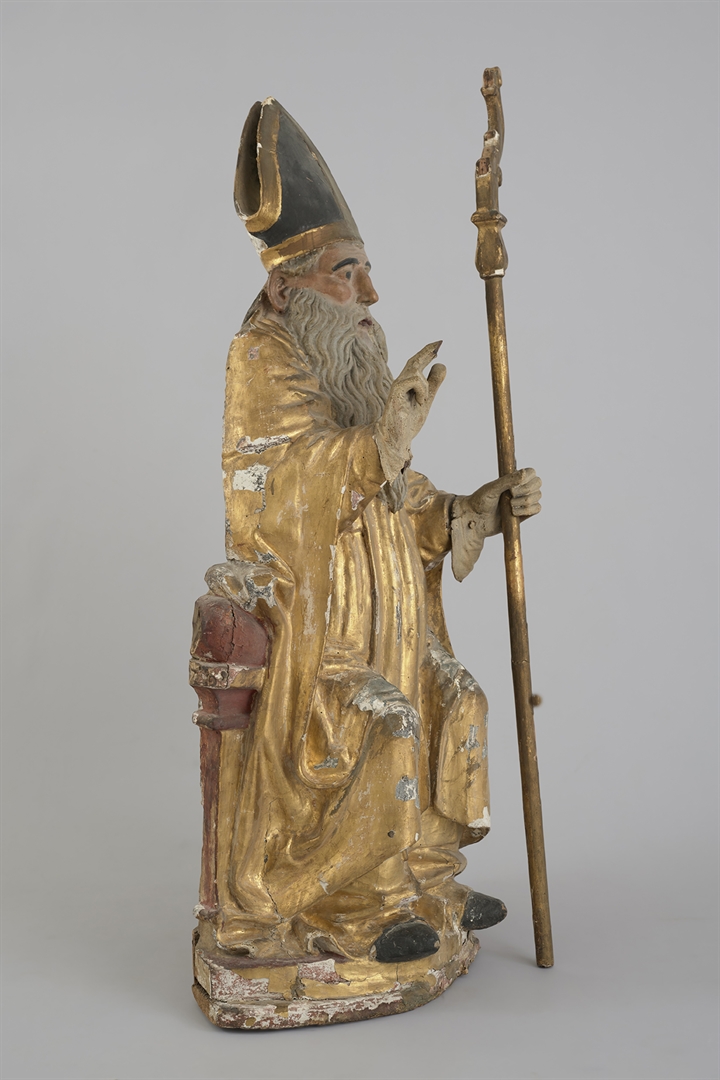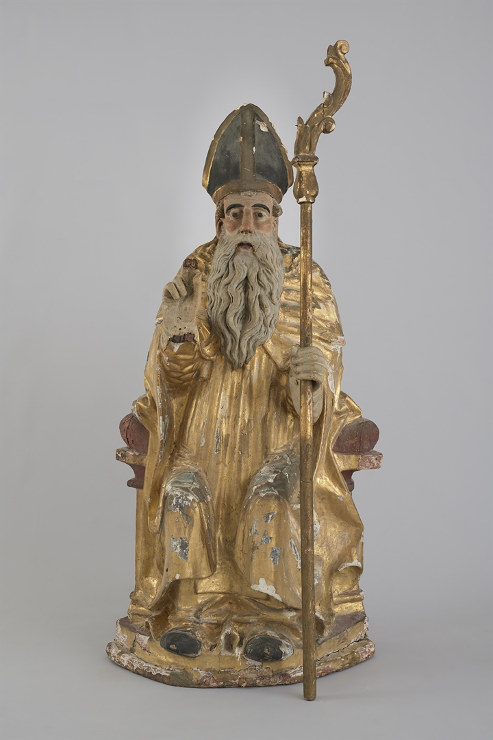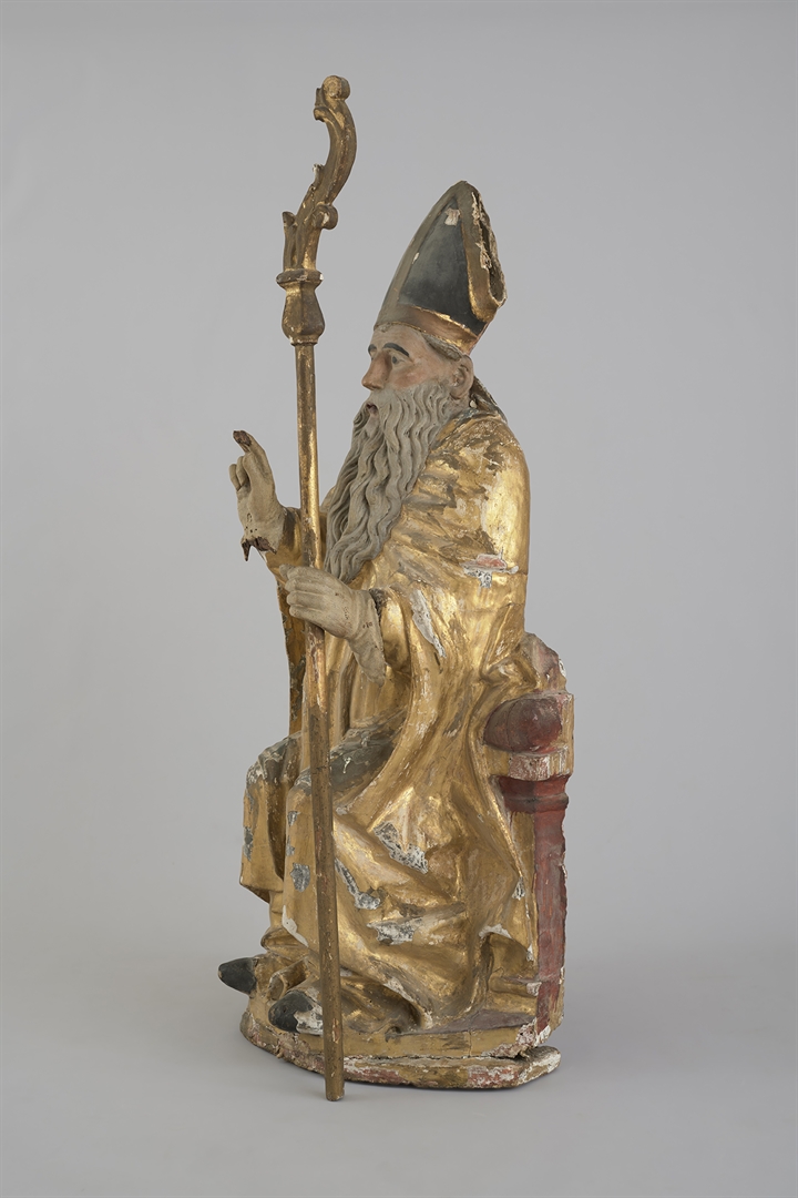 Drveni svetac sjedi na prijestolju. Na glavi je tiara tamno-zelena sa zlatnim rubom. Duga bijela brada i brkovi. Ogrnutj je zlatnim plaštom koji se spaja sa haljinom i pada preko nogu. Bijela desna ruka podignuta u blagoslov. U lijevoj drži pastirski štap sa bogatim zavojem. Noge obuvene u crnim cipelama. Figura je na zlatnom soklu. (Inventarna knjiga 1-3, 1. tom)