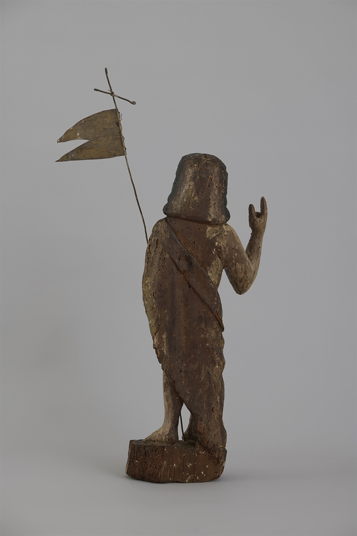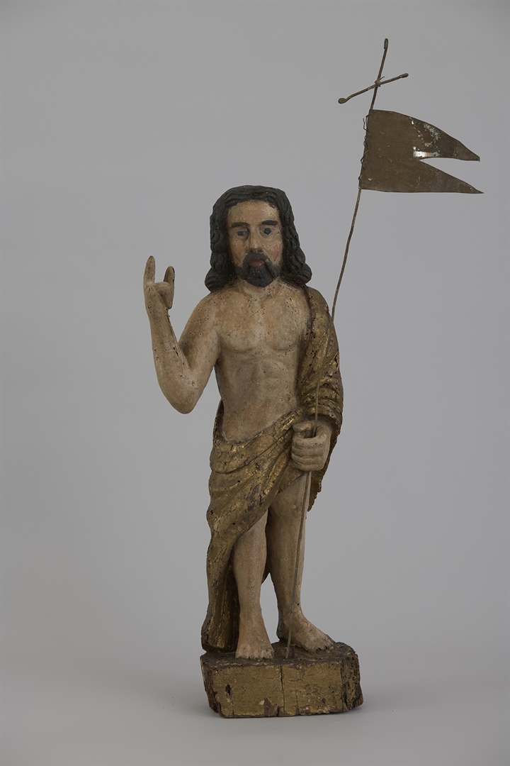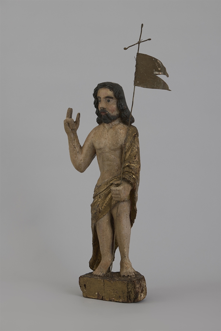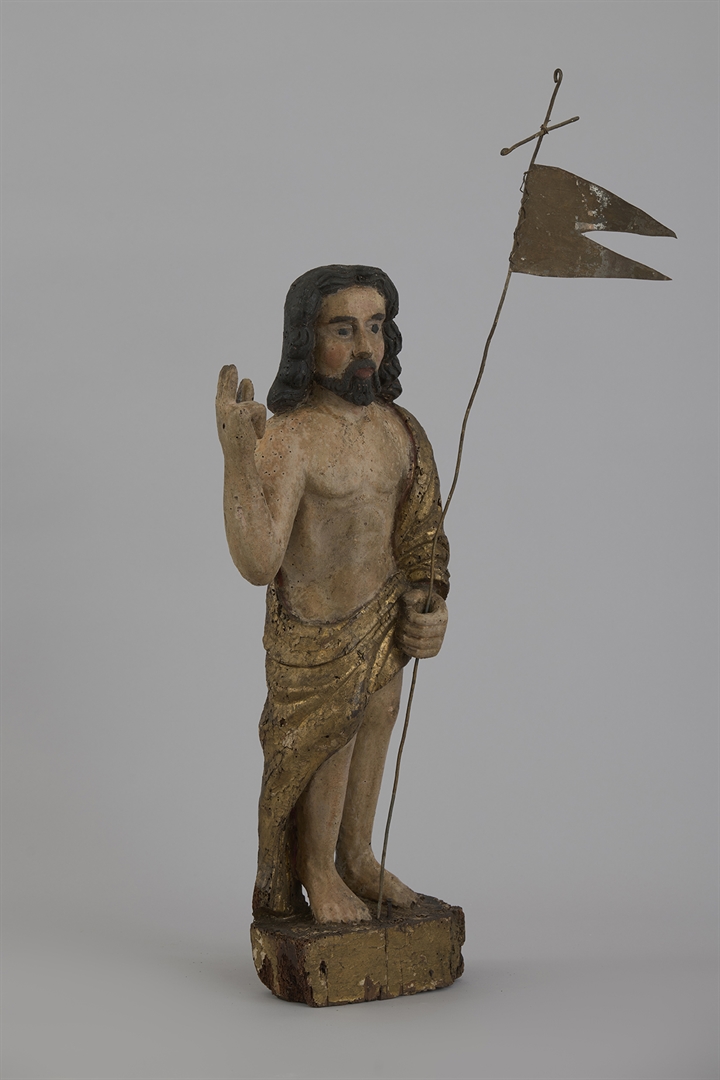 Drvena figura Isusa koji stoji uzdignutom desnom rukom sa tri izdignuta prsta. U lijevu ruku, priljubljenu uz kuk, utaknuta je žica koja se završava u obliku križa i na kojoj je prišivenom žicom ploča od pleha u obliku zastave. Kosa, brada, brkovi, obrve i zenice oka crni. Usne crvene, inkarnat lako ružičast na obrazima. u glavu utaknuta aureola odozdola pozlaćena kao i plašt koji se spušta sa desnog ramena do pasa prekrivajući desnu ruku, i preko lijeve noge dodiruje konzolu. Figura jako oštećena crvotočinom. Ponegdje u naborima plašta, stara pozlata još svjetluca dok je cijela aureola još zlatna. Pozadina figure neizrađena i nefarbana. U leđima klin sa žicom o kojoj je figura bila obešena. (Inventarna knjiga 1-3, 1. tom)