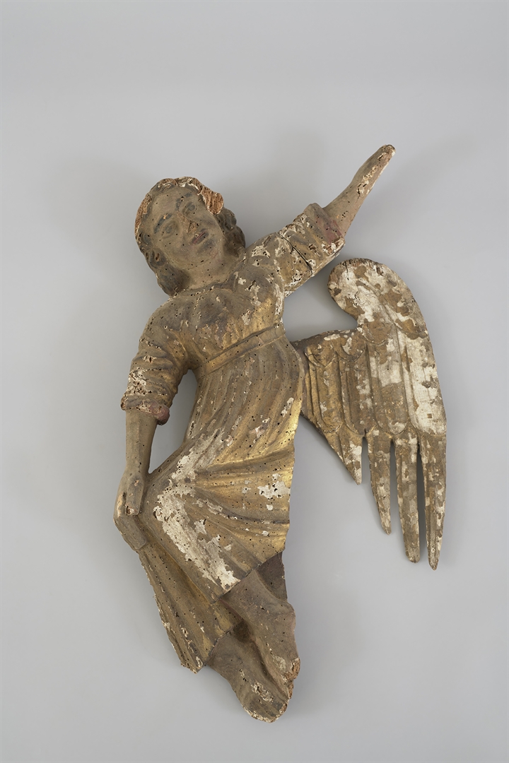 Ženski lik duge crne valovite kose. Crne obrve, zenice i trepavice. Tijelo je jako povijeno na desnu stranu i prekrivenom košuljom, sa srcolikim ovratnikom pridržanom o pasu vrpcom. Rukavi sa naborima do lakata. Desna ruka spuštena na koljeno dok je lijeva uzdignuta i ispružena. Haljina do nogu, a noge su ispružene i bose. Pozadina skulpture neobrađena, gotovo polurelijev. Posebno od figure nalazi se drveno krilo koje je moralo biti utaknuto na desno rame. (Inventarna knjiga 1-3, 1. tom)