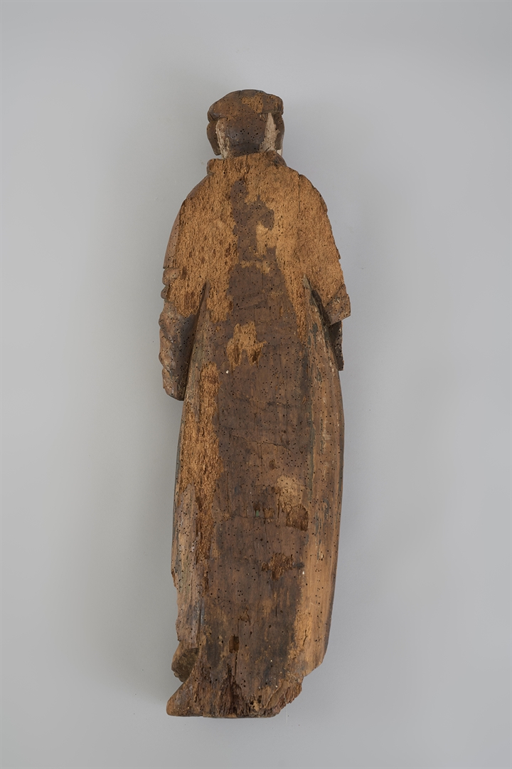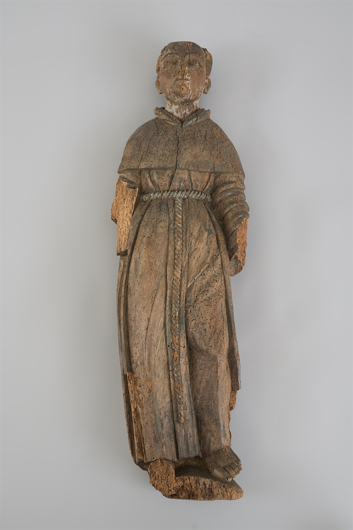 Kip sveca u fratrovom odijelu. O pasu franjevačko uže. Na glavi tonzura. U desnoj ruci knjiga. Lijeva ruka fali. Noge bose. Boja smeđa. Kip je na više mjesta oštećen crvotočinom. (Inventarna knjiga 1-3, 1. tom)