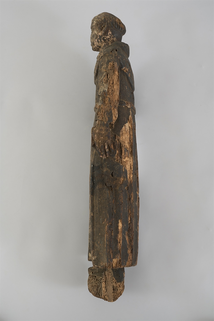 Drvena figura u fratrovom odijelu. Desna ruka fali do lakta. Lijevom pridržava knjigu. Na glavi tonzura. Cijeli je kip tamno smeđe boje. Na više mjesta, naročito na soklu oštećen crvotočinom. (Inventarna knjiga 1-3, 1. tom)
