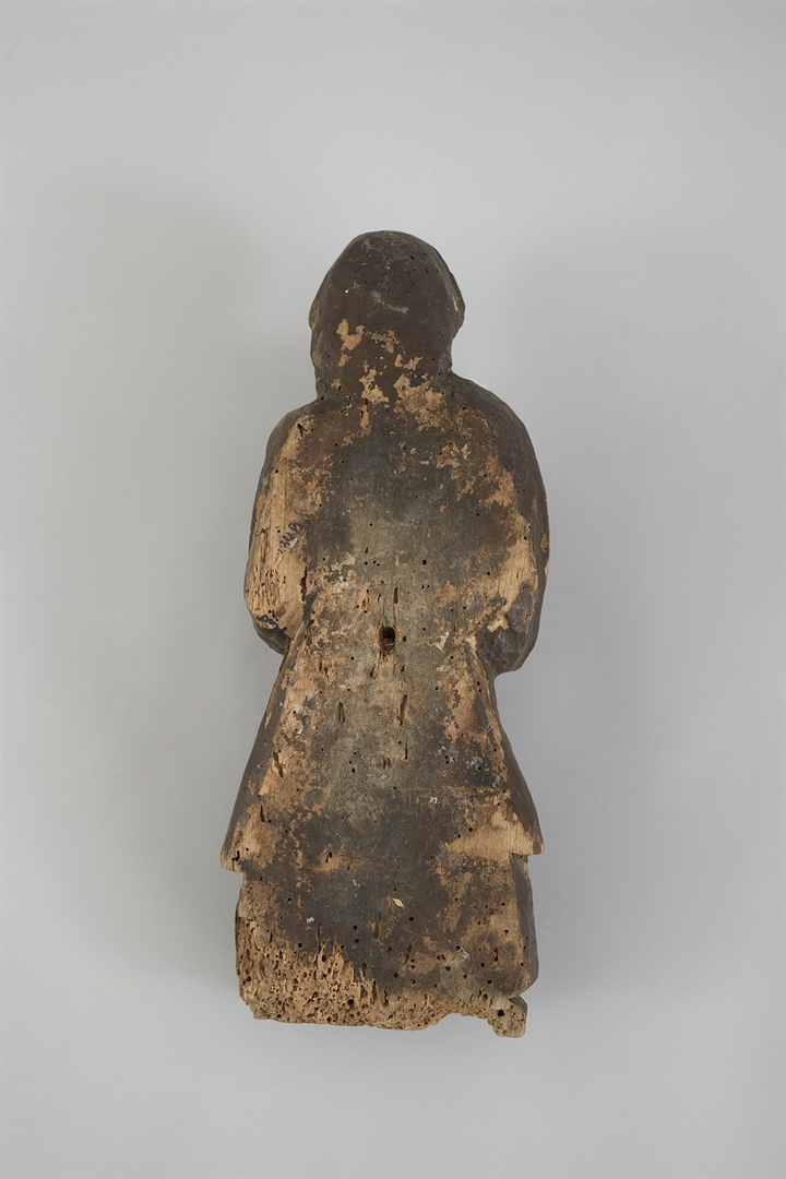 Lik žene sa tamnim plaštom na glavi i ramenima. Desnom rukom pridržava plašt na grudima. Lijeva ruka fali. Ispod plašta vidi se tamna crvena haljina. Inkarnat lica tamni. Donji dio i sokl oštećen crvotočinom. (Inventarna knjiga 1-3, 1. tom)