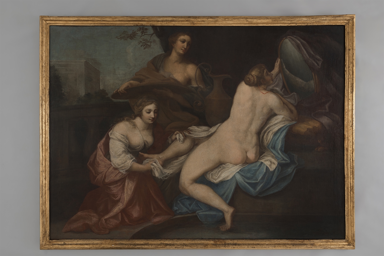 Prema podacima iz muzejskih inventara, ova je slika reprezentativnog formata pripadala zbirci baruna Georga von Hütterotta, a spominje ju i Branko Fučić u popisu dobara njihova nekadašnjeg posjeda na Otoku sv. Andrije (1945:7). Prikazana je naga Venera kako sjedi izvijena tijela, okrenuta leđima promatraču, nakon izlaska iz kupelji. Promtra se u ogledalu, dok joj dvije mlade pratilje pomažu pri toaleti. Prizor se odvija u sumarno naznačenom prostoru poluinterijera koji je kamenim parapetom odvojen od vrta na lijevoj strani, dok je desna strana zatvorena tamnom plohom zida. Svijetli krajolik s vedutom udaljene građevine pruža se u pozadini, iza kamenog zida ograde. Tema Venere na kupanju ili Venerine toalete potječe iz antike. Božica ljubavi redovito je prikazana kako izlazi iz kupelji i suši se "sramežljivo prikrivajući, odnosno otkrivajući pojedine dijelove tijela" (Aghion, Barbillon, Lissarrague 1996:297). Među najpoznatijim redakcijama teme čuvena je Kapitolijska Venera izvedena, kao i mnoge druge antičke varijante, u mramoru, knidijskog tipa, a prethodili su joj grčki originali u bronci. Drugom tipu Venere na kupanju pripadaju prikazi božice u čučnju, često u Amorovoj pratnji (Bober, Rubinstein 1986:61-63). U ikonografiji teme oživljene u renesansi Veneru također prati Kupido, a kasnije joj pri toaleti pomažu i pratilje, kao na ovom primjeru iz rovinjskog muzeja. Tema je varirana u nizu kompozicija tijekom 16. i 17. stoljeća, kada zbog erotskog prizvuka postaje omiljenom među kolekcionarima. Prizor je često dopunjen raskošnom scenografijom i obiljem predmeta vezanih uz žensku toaletu. Prepoznajući "snagu ticijanovske tradicije" Grgo Gamulin (1973/74:79-80; 1990:77-78) je rovinjsku sliku povezao s majstorima mletačkog seicenta u čijim se djelima očituju značajke baroknog klasicizma usredotočenog na evociranje slikarskih rješenja 16. stoljeća. Zbog tih je obilježja sliku s temom iz antičke mitologije pripisao najprije Alessandr Varotariju Padovaninu (Padova 1588. - Venecija 1649.), da bi je nakon restauratorskih radova ipak smjestio u kasnije razdoblje seicenta, približavajući je opusu Gregorija Lazzarinija (Venecija 1655. - Villabona di Rovigo 1730.). Tipologija likova i detalji slikarskog oblikovanja nisu, međutim, posve sukladni obilježjima Lazzarinijeva slikarstva te Veneru na kupanju nije moguće uključiti u veliki opus ovog venecijanskog majstora. Može se tek približiti istom krigi utjecaja u Veneciji krajem 17. stoljeća na što, uz stilske značajke, posebno upućuju njezine akademizirajuće forme. Datiranje slike u posljednje godine seicenta podupire i autorovo priklanjanje obnovljenom intersu za motive i koloristička rješenja venecijanskog 16. stoljeća, bez obzira na još uvijek prisutan chiaroscuro u oblikovanju. Nepoznati je slikar lik Venere preuzeo sa slavne Tizianove kompozicije s temom rastanka božice ljubavi i Adonisa. Rastanak Venere i Adonisa jedna je od poesia iz ciklusa s mitološkim temama iz Ovidijevih Metamorfoza koju je Tiziano Vecellio naslikao pedesetih godina 16. stoljeća za španjolskog kralja Filipa II. (Hope 2003:142-143). Zanimljivo je da se i venecijanski slikar za prikaz Venere poslužio starijim predloškom - rimskim reljefom poznatim kao "Polikletova postelja" (Letto di Policleto) na kojem je prikazana Psiha kako se naga okreće prema usnulom Amoru. To je antičko djelo bilo poznato u humanističkim krugovima već u 15. stoljeću, a u svojim su ga djelima reinterpretirali slikari poput Rffaella ili Gilia Roman (Bober, Rubinstein 1986:125-127, sl. 94). Tizianovu sliku dodatno je proslavio i Lodovico Dolce nadahnutim opisom "koji predstavlja najiscrpniji preživjeli tekst suvremene kritike o nekom Tizianovom ostvarenju" (Hope 2003:142-144). O velikoj popularnosti ove invencije svjedoči i više autorovih replika te radioničkih kopija, a kompozicija je bila raširena i putem grafičkih prijevoda. Veneru, koja se izvijenim tijelom okreće Adonisu pokušavajući ga zadržati, nepoznati je autor rovinjske slike doslovno kopirao s Tizianove slike uključujući je u novi prizor. Scenografija koja prati toaletu božice ljubavi govori pak o poznavanju kasnijih kompozicijskih varijacija motiva Venera na kupanju. Osim izborom antičke teme, njezin autor i slikarskim rješenjima nastoji slijediti akademizam klasicističke struje mletačkih slikara krajem 17. stoljeća. Nespretan okret i položaj Venerine glave govori o slikarskim slabostima majstora koji neizražajnim koloritom i pojednostavljenim slikanjem krajolika ne nadilazi razinu osrednjeg eklektičnog slikarstva. Likovno je uvjerljivije sugerirana blijeda put božice ljubavi u kontrastu s plavom draperijom, istaknuta na tamnoj pozadini, a uspio je i klečeći lik pratilje ogrnute bogatim crvenim plaštem. U njezinoj tipologiji, načinu slikanja nabora tkanine te osobito detaljima fizionomije, očituju se i utjecaji Antonija Belluccija (Venecija 1654. - Pieve di Soligo 1726.), slikara koji klasicizirajuće, akademske oblike, ponekad još s odjecima tenebrosa, krajem osamdesetih godina seicenta počinje interpretirati na slikarski slobodniji način, rasvjetljavajući paletu i revalorizirajući dekorativni karakter boje. (V. Bralić u: Slikarska baština Istre, 2006., str. 471-472)