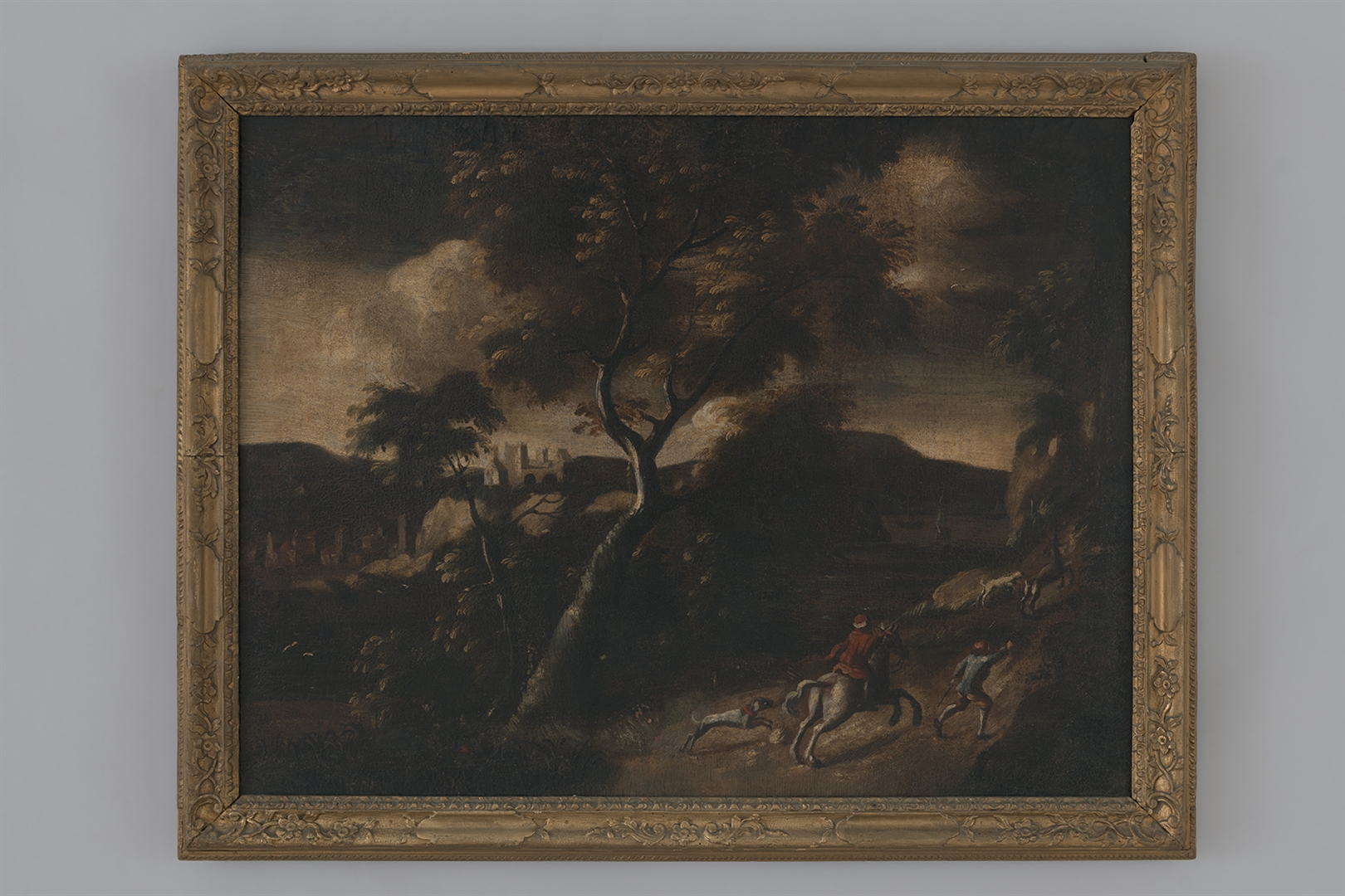 Lovačka scena. U sredini slike, veliko stablo. Na desnom donjem uglu konjanik, okrenut leđima, na bijelom konju u trci. Obučen je u crveni kaput, sa crvenim turbanom na glavi. U rukama drži luk i strijelu. Kraj njega trči drugi čovjek okrenut leđima, u zelenom kaputu sa smeđim hlačama do koljena i bijele čarape. Na glavi turban. U lijevoj ruci drži štap dok je desnu ispružio. Malo dalje ispod pećine bijeli pas. U donjem lijevom uglu vegetacija. U daljini na jednom brdu vidi se bijela tvrđava. U podnožju brda širi se grad. U pozadini tamne planine sa oblačnim nebom tamne boje koje prelazi u svjetlo prema horizontu. (Inventarna knjiga 1-3, 1. tom)